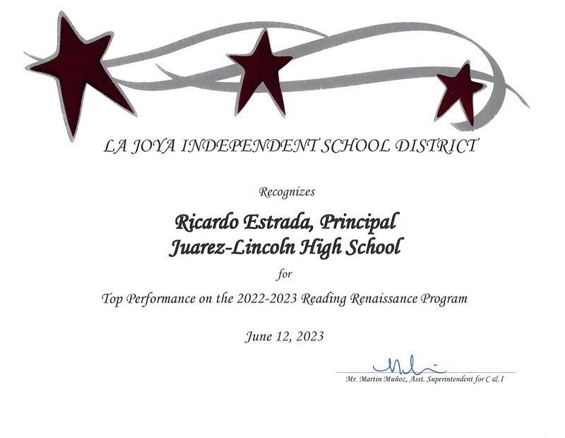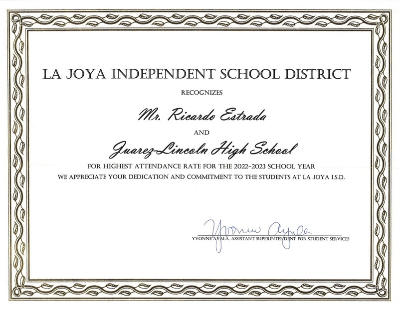 Our principal, Mr. Estrada recently attended a district meeting where he was presented with these certificates highlighting some of the many accolades Juarez-Lincoln High School received this year.