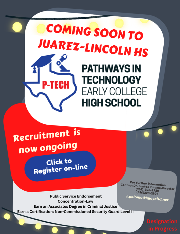 Coming soon to Juarez-Lincoln High School Pathways in Technology Early College High School (P-TECH). Recruitment is now ongoing. Public Service endorsement with a concentration in law. You can earn an Associates Degree in Criminal Justice or earn certification to be a Non-commissioned security guard Level II. For further information contact Dr. Santos Palomo, Director at 956-323-2920 or 956-323-2921 or email s.palomo@lajoyaisd.net. Designation in progress.